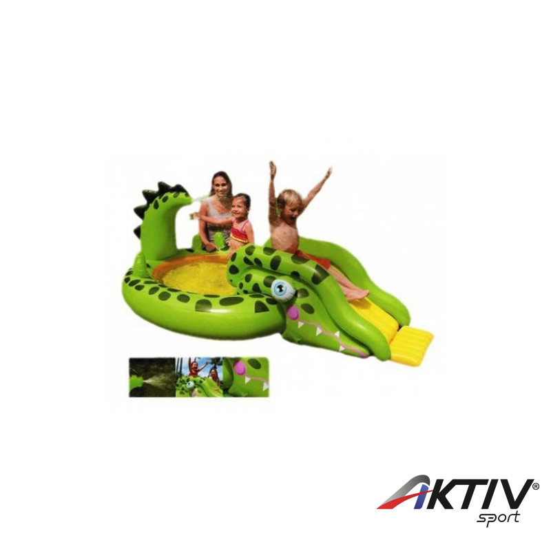 Felfújható, vidám, aligátor formájú medence, első részén felfújható csúszda résszel. Kerti slagra kötve az aligátor "farka" vizet spriccel a kis strandolókra. A medence mérete: 251×140×86 cm. A medence - lyukadás esetére - javító foltot is tartalmaz. 3 éves kor alatt nem ajánlott!