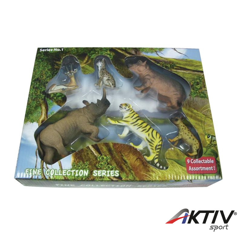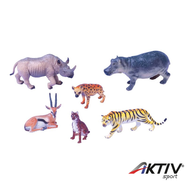 A készlet tartalma: tigris, rinocérosz, víziló, hiéna, gazella és hiúz.