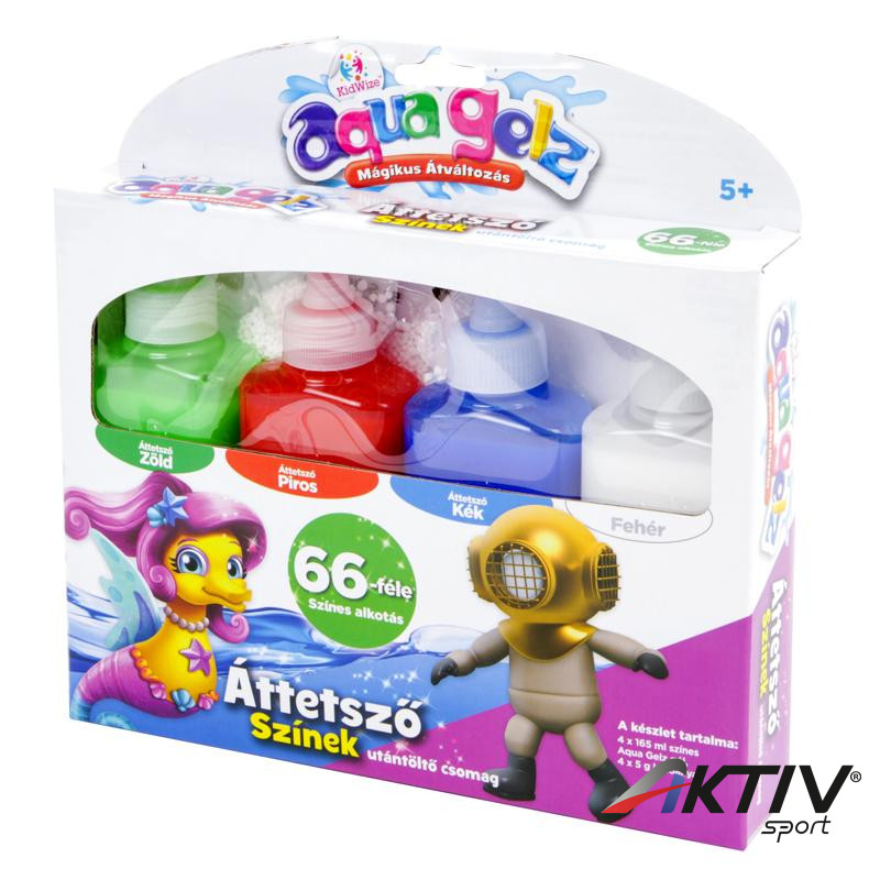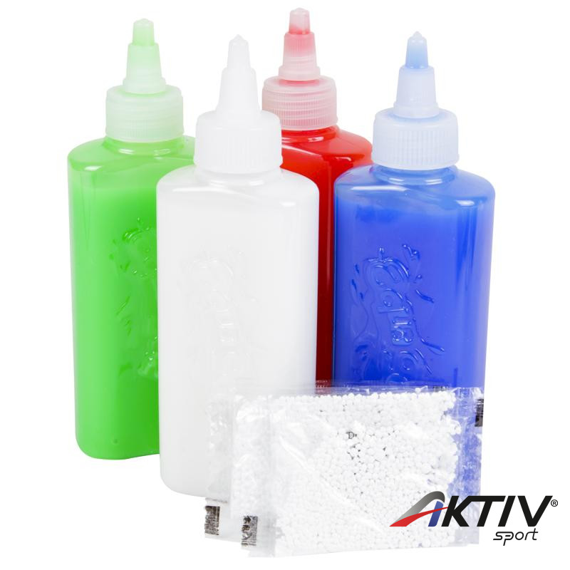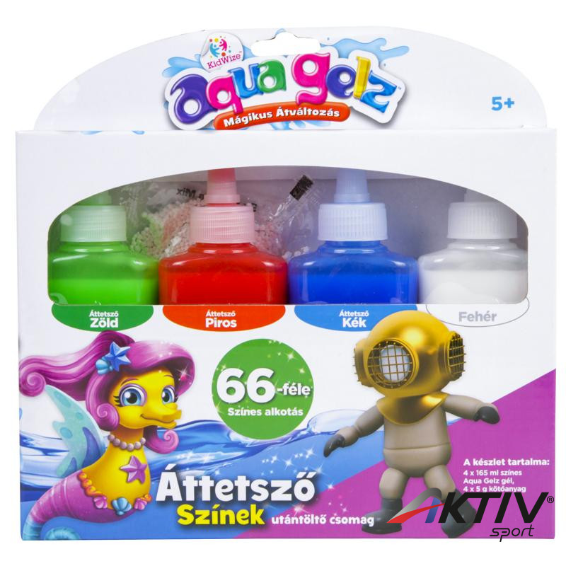 Az Aqua Gelz áttetsző utántöltő zöld, piros, kék és fehér színű, Aqua Gelz festékanyagot tartalmaz, amiket a zselékhez tudsz hozzákeverni. A festékeket bármelyik Aqua Gelz készlethez hozzá tudod adni, a csomagolás összesen 4 x 165 ml festékanyagot tartalmaz.