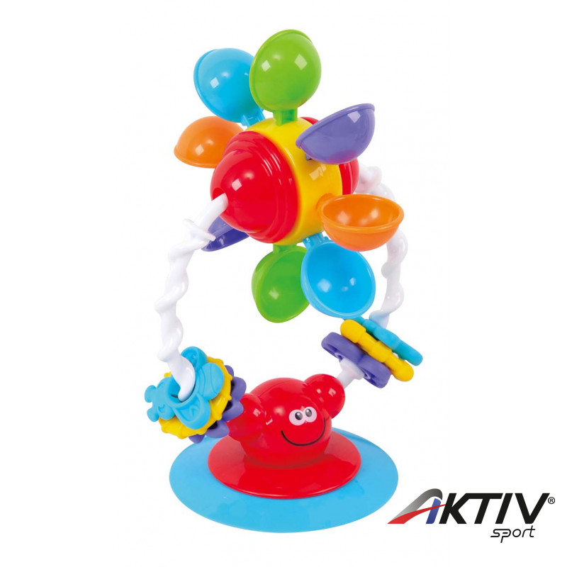 Ez a bébijáték az alján található nagy tapadókorong segítségével könnyedén az asztalhoz, vagy akár fürdés közben a kádhoz is rögzíthető.