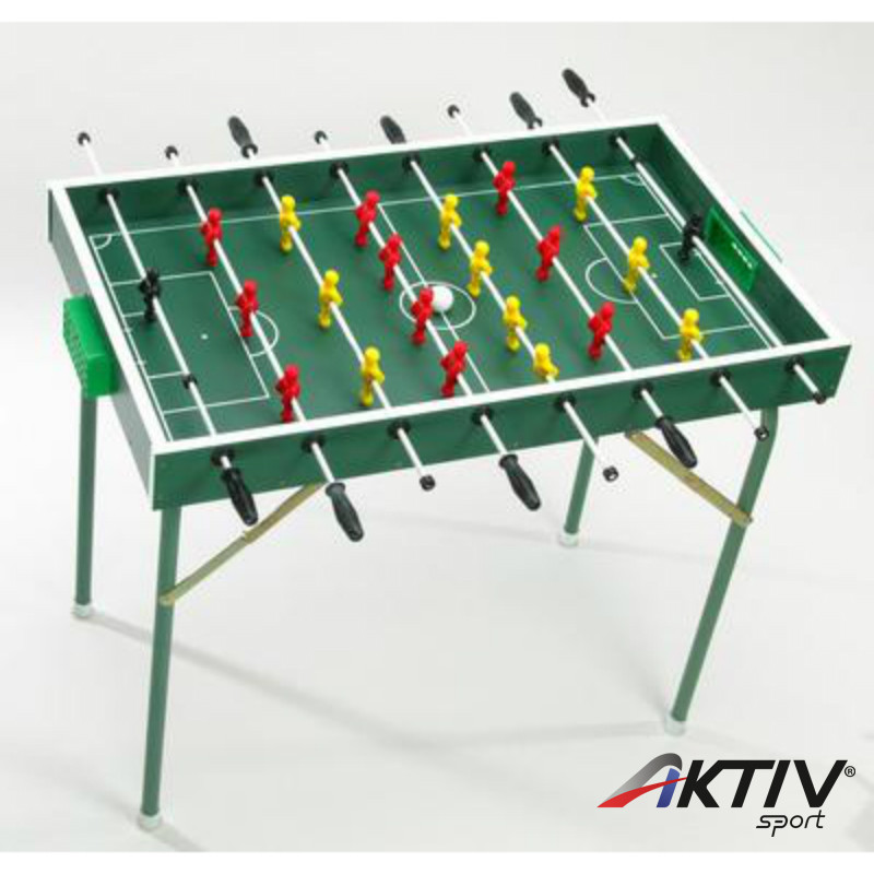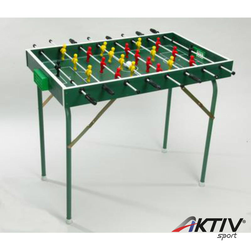 Asztalifoci nyitható lábbakkal. Az asztali foci zöld színű 19 mm-es faforgácslapból készült. A könnyű forgást, a rúd csúsztatását műanyag perselyek biztosítják. A játékbabuk tömör rúdra vannak felfűzve. A játékbábuk anyagában színezett műanyagból készülnek. Az egész játékot a tartósság és masszív kivitel jellemzi. Műanyag perselyekben forgó nyitható csőlábakkal.