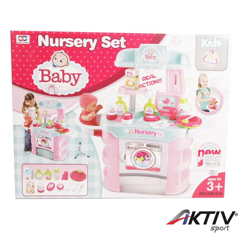A nagy Babaápoló 22 darabos készlet egy műanyagból készült játékállomás, ahol meg tudod etetni, vagy meg tudod fürdetni a babákat. A készlet több polccal, mosógéppel, mosogatóval is fel van szerelve, a baba tisztaságáról, egészségéről különböző fürdető krémek, tápszerek gondoskodnak. A babát be tudod ültetni a székbe, hogy könnyebb legyen az etetés, a kinyitható mosógépbe be tudod tenni a koszos ruhákat is, hogy tisztává varázsolhasd őket.