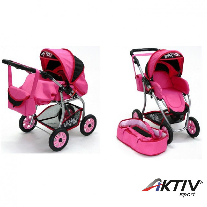 Mély kivitelű, 3 funkciós játék babakocsi. Az igazi babakocsik valósághű, kicsinyített mása. Nagyon masszív kivitel, súlya: kb. 4,5 kg. Összecsukható, valamint átalakítható sport modellé. A kormánymagasság: 58-68 cm között állítható, a textil mózeskosár hossza: kb. 48 cm. A babakocsihoz színben igazodó textil kistáska tartozik.