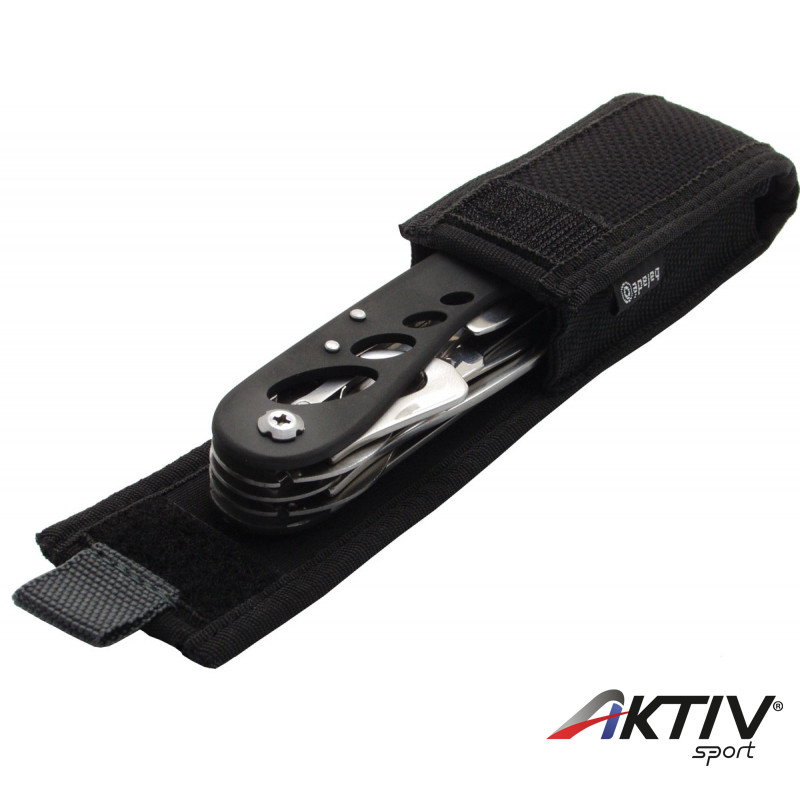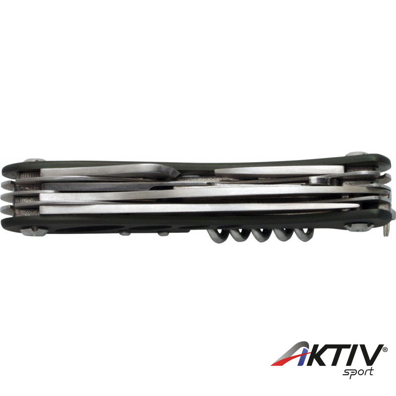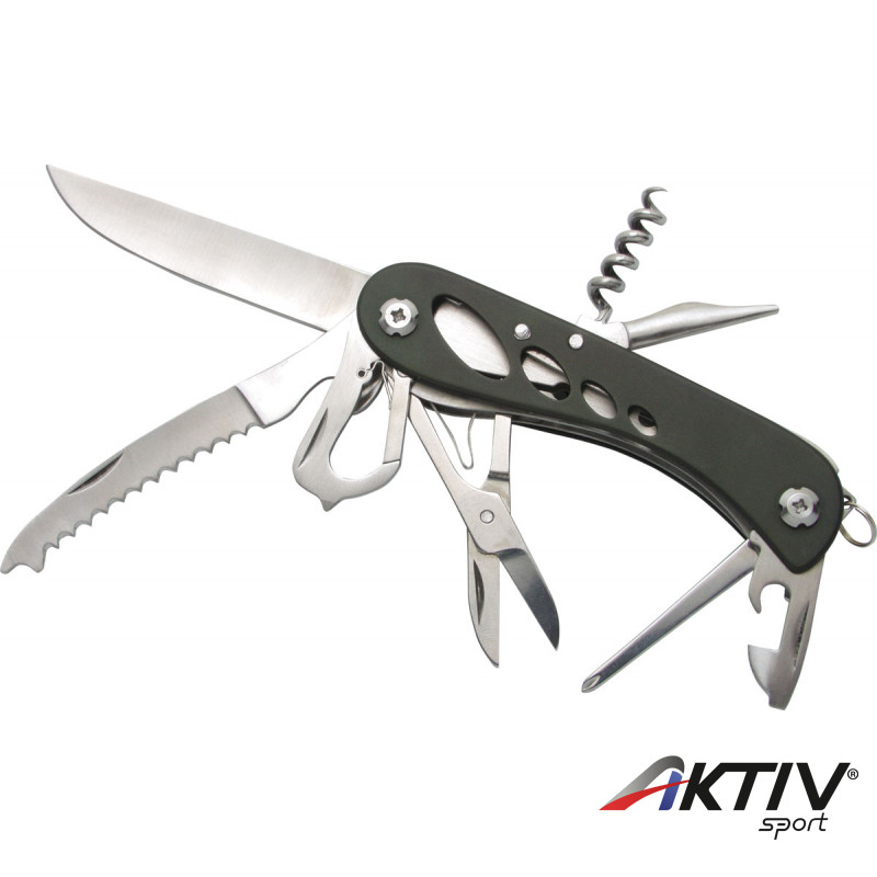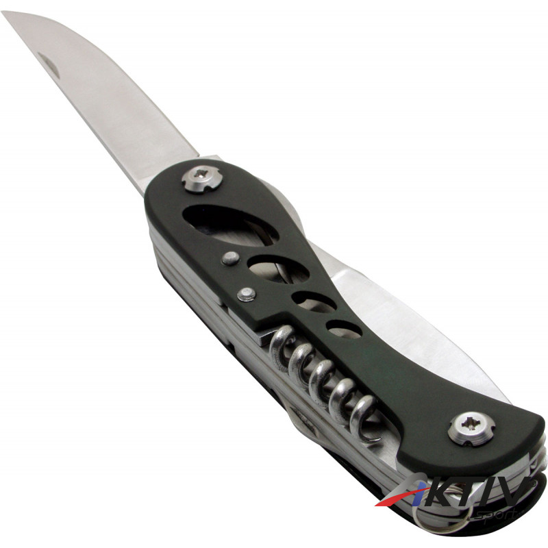 A kés pengéje és további eszközei rozsdamentes acélból készültek, markolata alumínium, gumírozott felületű. 12 funkció: rögzíthető késpenge, fűrész, dugóhúzó, olló, Philips csavarhúzó, üvegtörő, karabiner, rögzíthető konzervnyitó, 2 mm-es lapos fejű csavarhúzó, sörnyitó, tűbefűző, kulcskarika.
