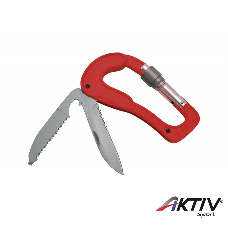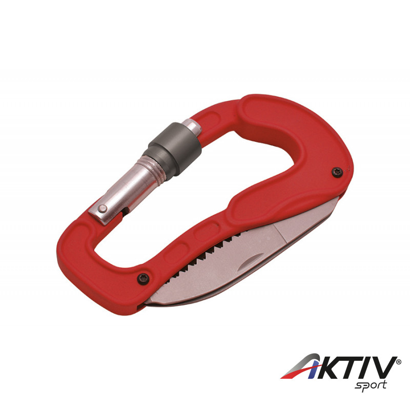 Karabiner, amit összekötőelemként használható, valamint két penge bújik meg benne. Egy fűrész és egy fogazott késpenge. Használaton kívül a pengék észrevétlenül lapulnak a helyükön, egészen addig míg hadra nem kell fogni őket.