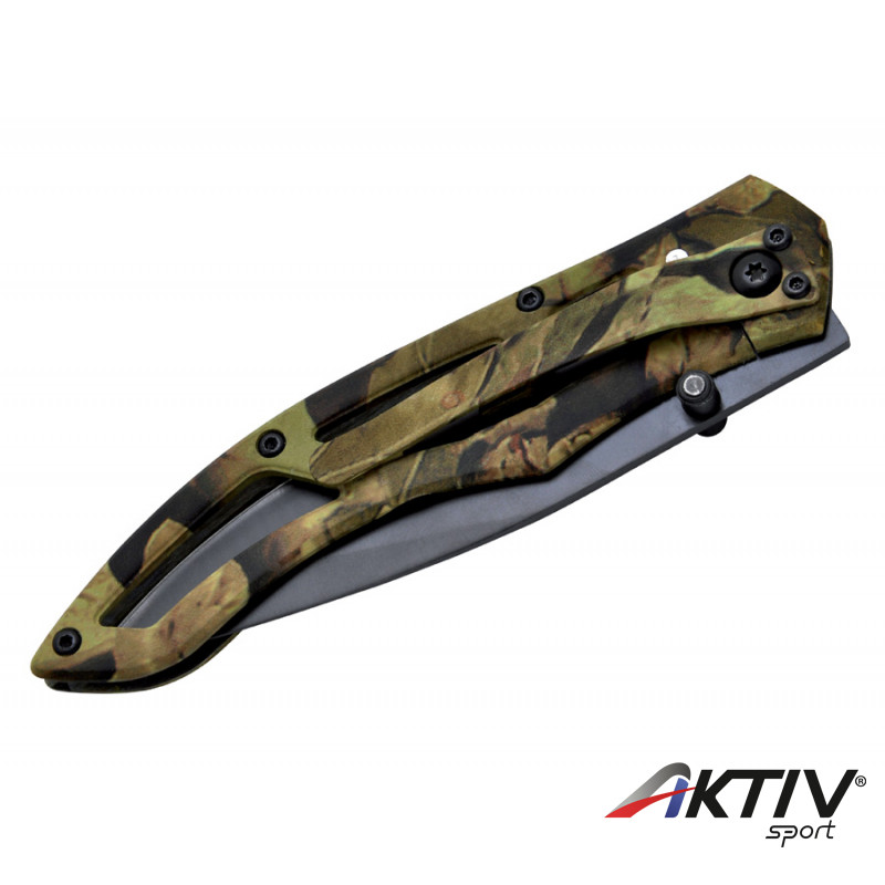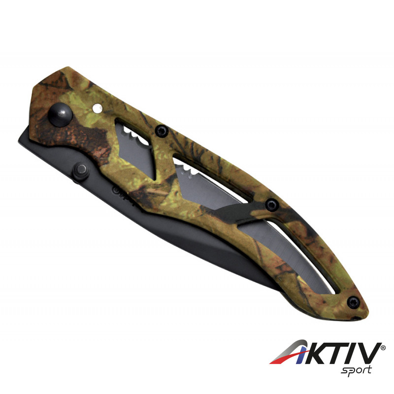 Modern formavilágú vadász zsebkés, amely terepmintás könnyített markolatával és tükröződésmentes pengéjével a rejtőzködésben segíti használóját.