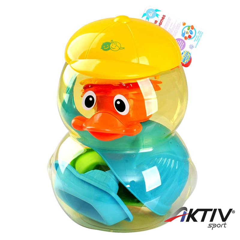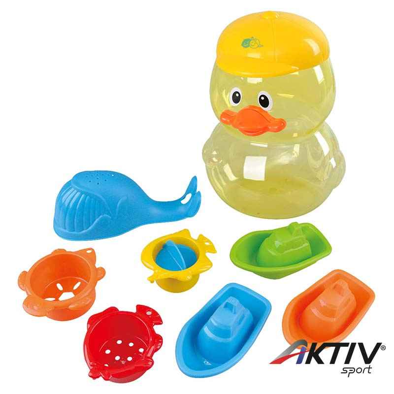 A készlet tartalmaz egy sapkás kacsás tárolót, három különböző színű vízen úszó kishajót, egy bálnás és három különböző színű tengeri állatos vízmerítőt, amikből a víz az aljukon lévő réseken kifolyik.