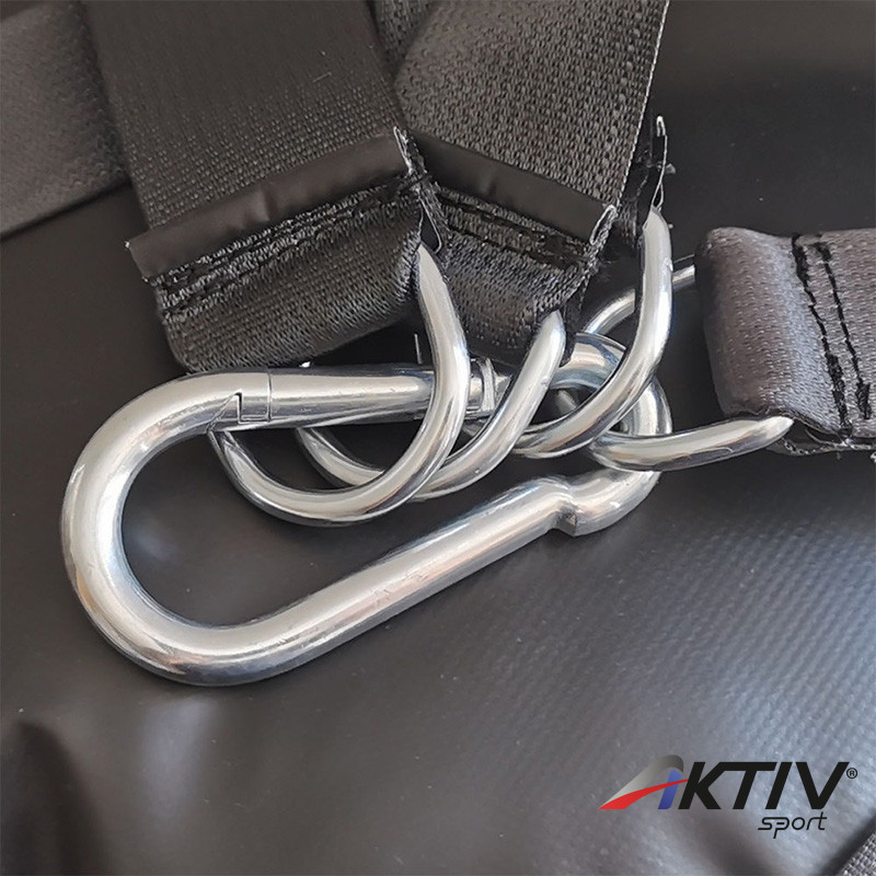 Ezen boxzsákoknál a felfüggesztéshez a láncot biztonsági öv hevederrel váltottuk ki, ami azon kívül, hogy rendkívül strapabíró, a hagyományos zsákokhoz képest nem csörög/zörög, ami kifejezetten jól jön az otthoni, vagy fitness termi közösségi használat során.