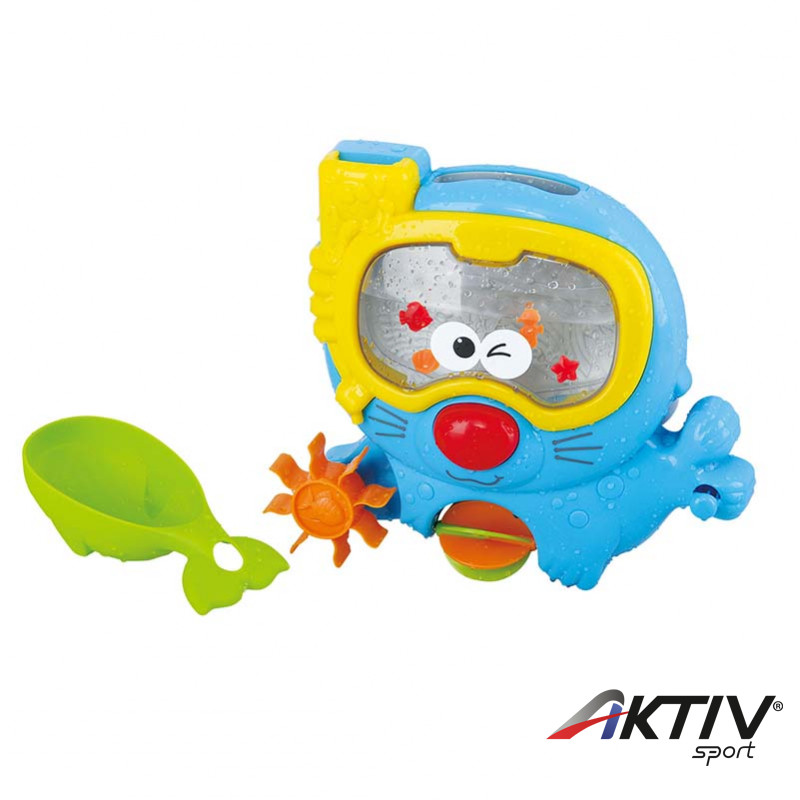 Ha a kisfóka fejének tetején lévő nyíláson keresztül vizet töltünk bele, akkor a búvárszemüveg rész megtelik vízzel, a benne lévő műanyag tengeri állatformák pedig lebegni kezdenek a vízben.