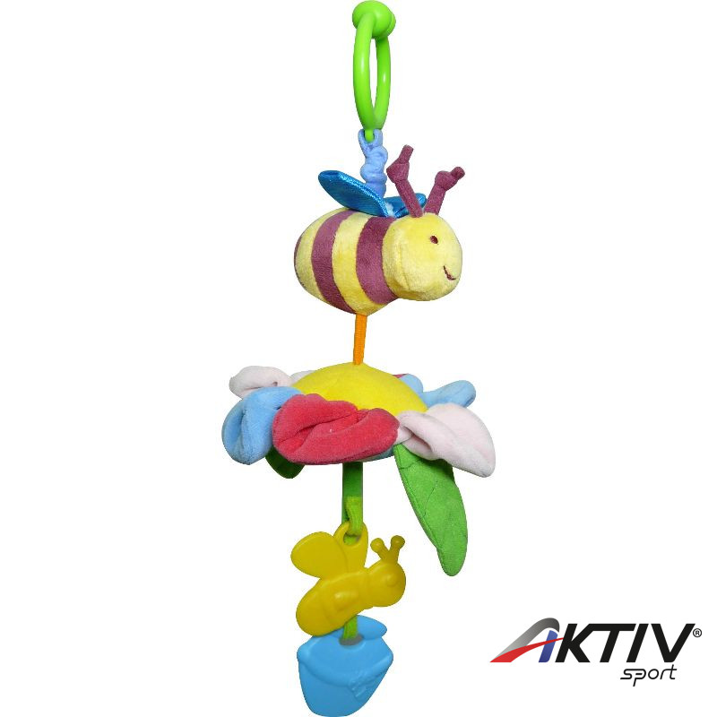 Kiságyra, babakocsira és hordozóra felcsiptethető babajáték. Fogzást segítő műanyag rágóka is található rajta, a textil virágon és méhecskén kívül.