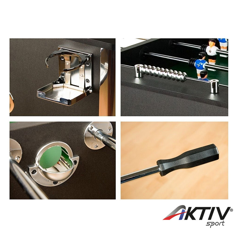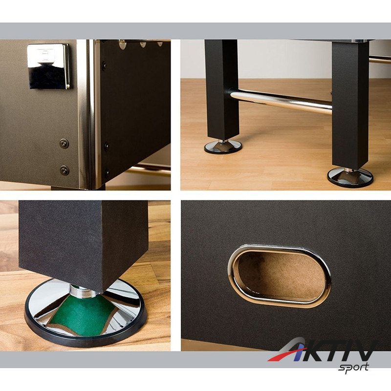 A csocsóasztal rudazatai csúszócsapágyas kivitelűek. Oldalfala 2,5 cm vastag anyagból készül. Mindkét oldalon labdaelvezető nyílás található, azaz találat után a labda kényelmesen a bedobó játékoshoz gurul. Mindkét játékos oldalon található labdabedobó nyílás.