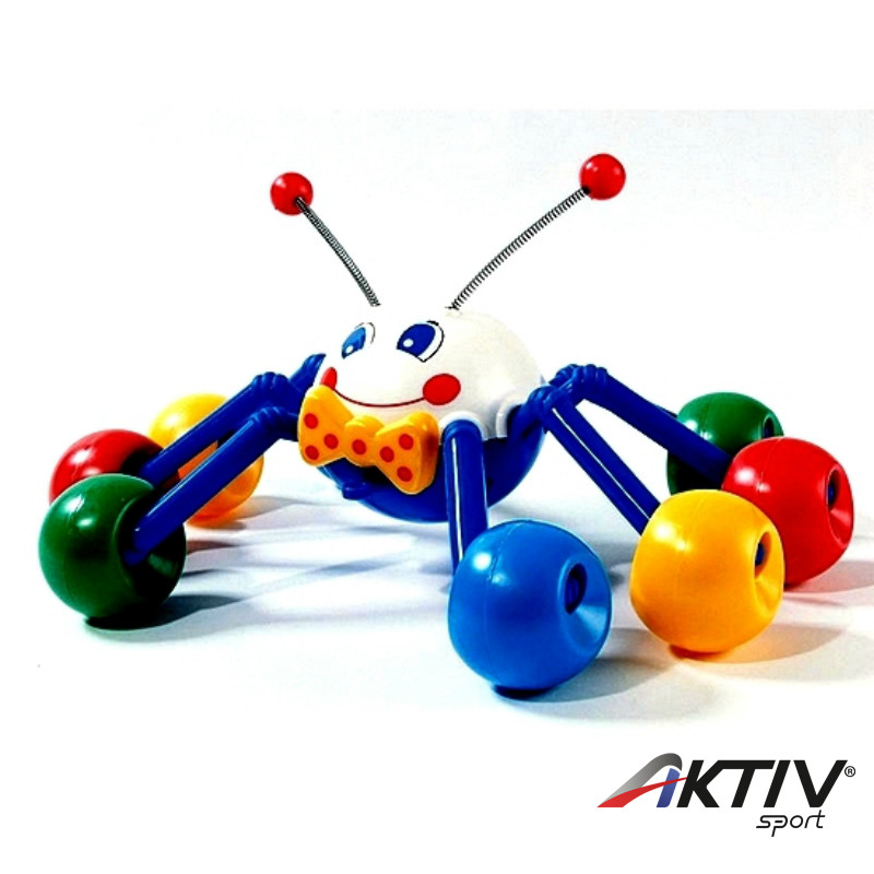 8 lába van, rajta színes excenteres kerekekkel. Ezért, mikor húzza a gyerek, a pók hullámozva, ugrálva gurul a padlón, mókás rugó antennákkal, mosolygó arccal és nyakkendővel.