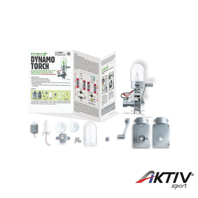 A készlet segítségével egy egyszerű játékot alakíthatsz át elektromos motorgenerátorrá. Az összeépített generátor használható elemlámpaként. Környezetbarát, mert nem használ elemet. A dinamó zseblámpa készlet megtanít a generátorok működésére, látványos módon! A dinamó lámpához nem kell elem, nem szennyezi a környezetet, csak felvillanyozza az elmédet! A dinamó elemeit össze kell szerelni, majd tekerd meg a kurblit és a lámpa kísérteties, de éles zöld fénnyel fog világítani! Ha unalmasnak tartod a lámpa buráját, akkor szerezz egy üres műanyag flakont, és arra csavard rá a dinamó lámpát! A dinamó zseblámpa készlet vészhelyzet zseblámpának is használható, de elég fényt biztosít ahhoz is, hogy a sötétben tudj tájékozódni.