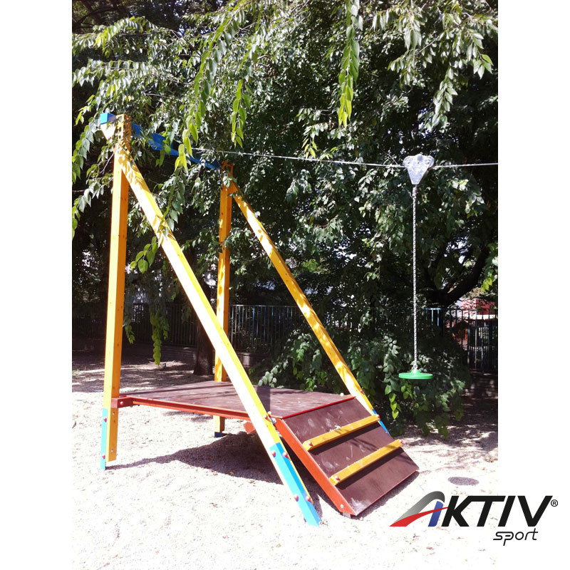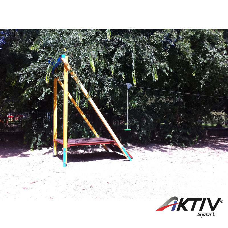 - Felépítés: Az induló és érkező rész vázszerkezete is I. osztályú ragasztott fenyőből készül, fém betonozható tartólábakkal. Az ülőkerész alumínium betététtel készül rugalmas gumiborítással, a lánc szett kis szemnagyságú 5 mm-es szemvastagságú, hogy a gyermek kezét ne csípje be hintázás közben. A drótkötél feszessége hőtágulás figyelembevételével állítható, a csúszó kocsirész automatikus fékkel van ellátva, hogy biztonságosan használhassák a gyerekek. A teljes feszítő szerkezet, és csillapító rugó is galvanizált fémrészekből épül fel, a csúszó rész rozsdamentes acélból készül.