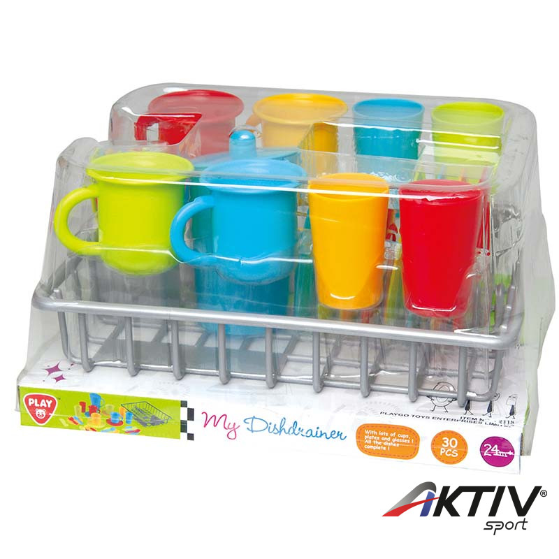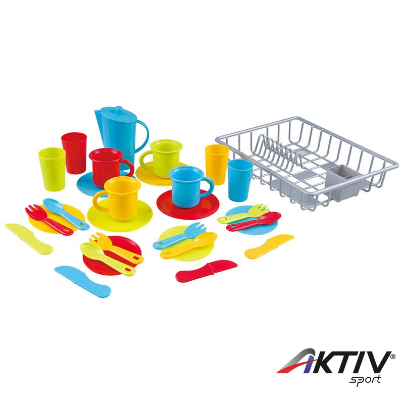 30 db-os edényszárító tányérokkal, csészékkel, poharakkal, evőeszközökkel és egy kancsóval.