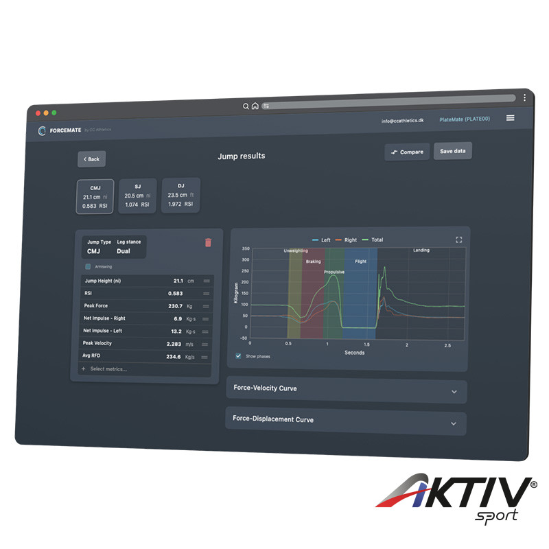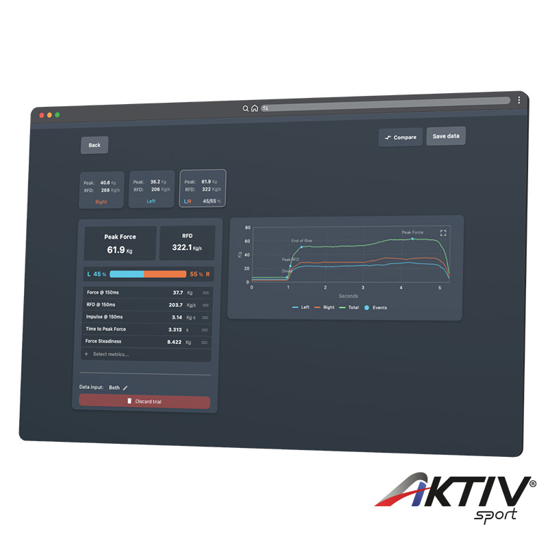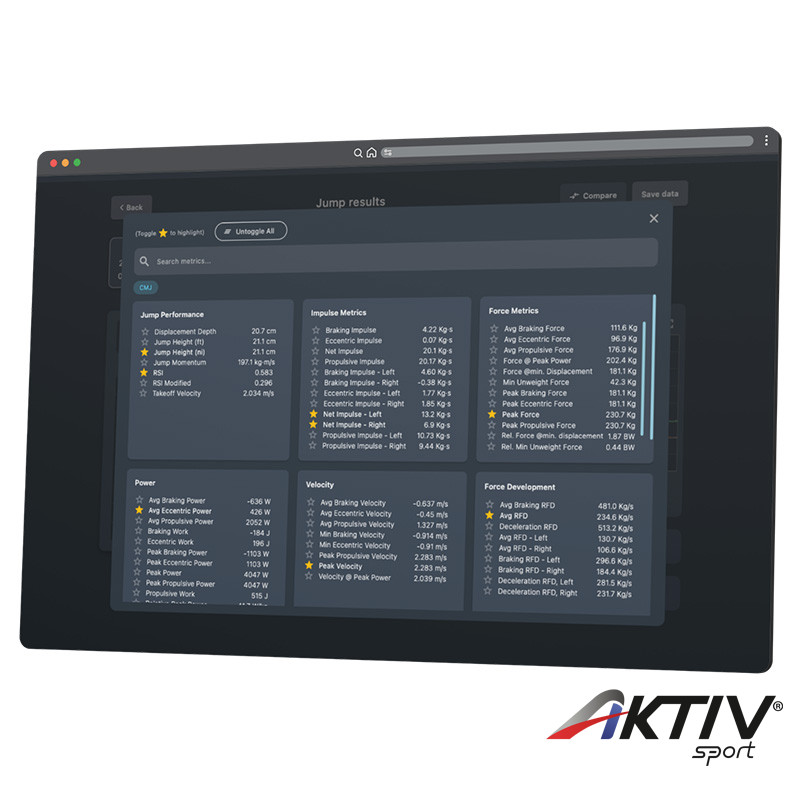 Elemezhetők vele countermovement, guggoló, ejtett és „pogo” ugrások több mint 85 különböző mérőszámmal - például ugrásmagasság, csúcserő, talajérintési idő, erőfejlesztési ráta (RFD) és még sok más. Az izometrikus tesztek 42 metrikát kínálnak, mint például a maximális erő és az RFD.