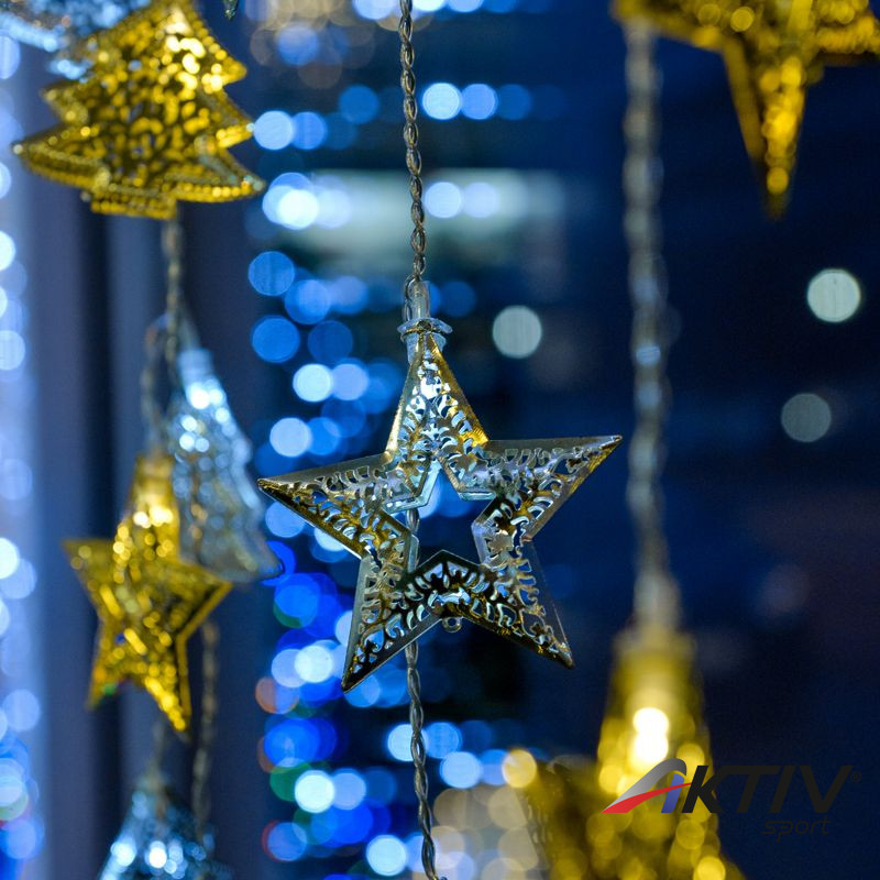 Ezeregyéjszaka fényfüggöny, átlátszó kábellel, fenyő és csillag díszekkel.