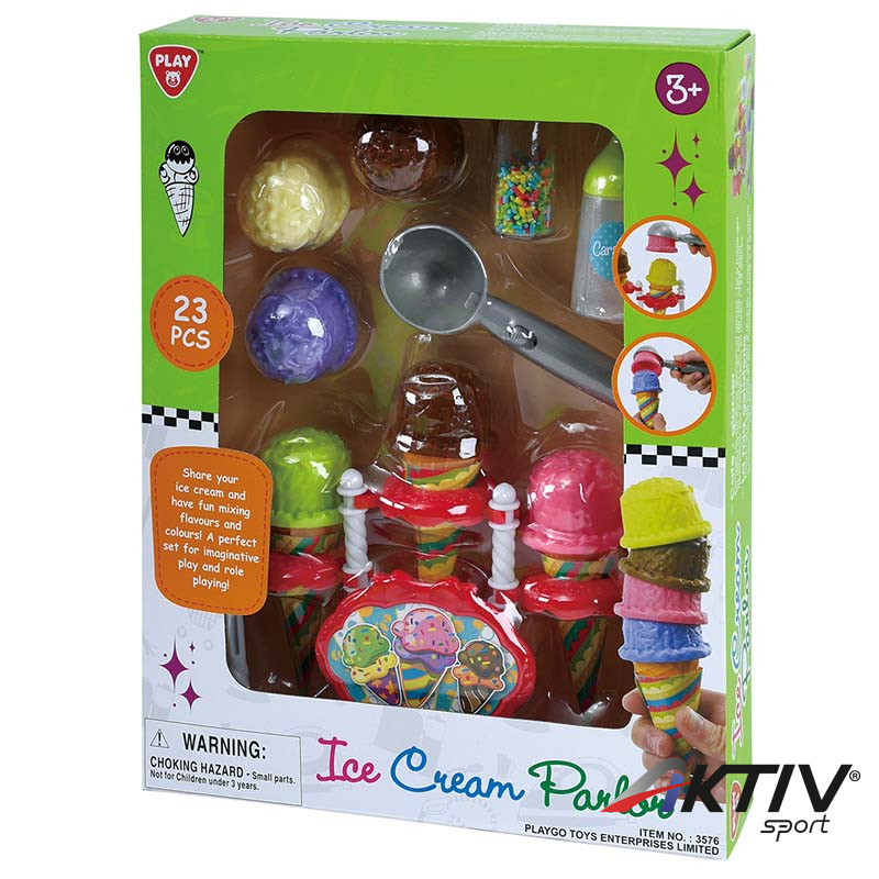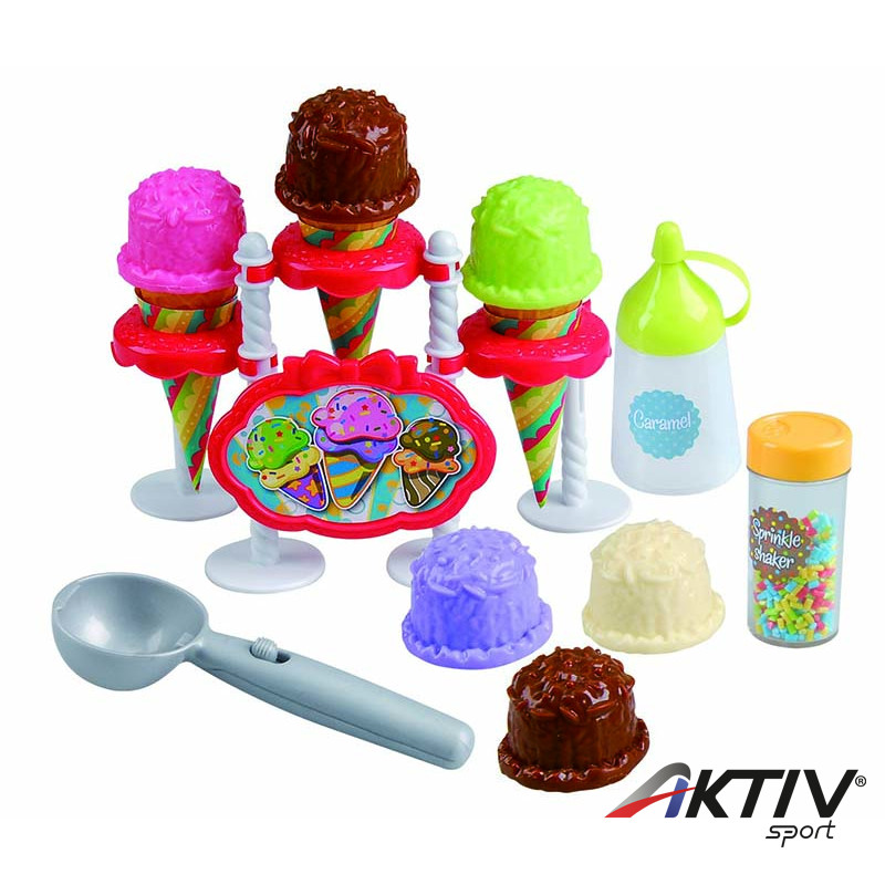 Party fagyizó készlet, fagyiállvánnyal, tölcsérrel, cukorszóróval, karamellöntettel, fagyikanállal és különböző fagyigombóccal.