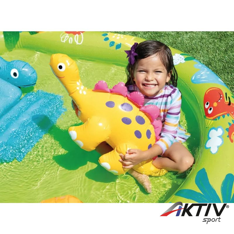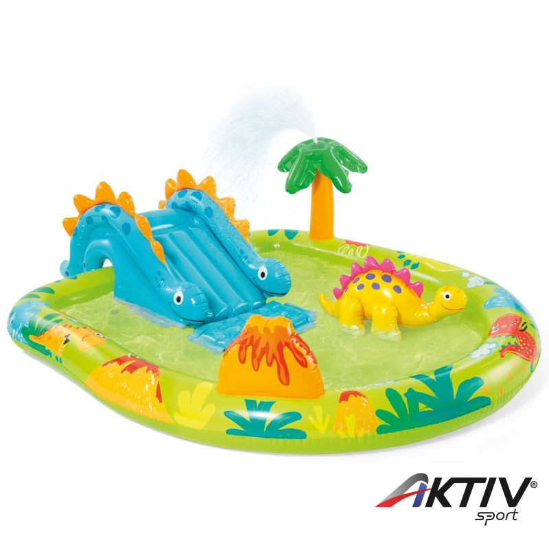 Csúszdával, egy dinóval és permetezővel felszerelt gyerekmedence. A medence űrtartalma 143 liter, a medence alján egy leeresztő dugó található.