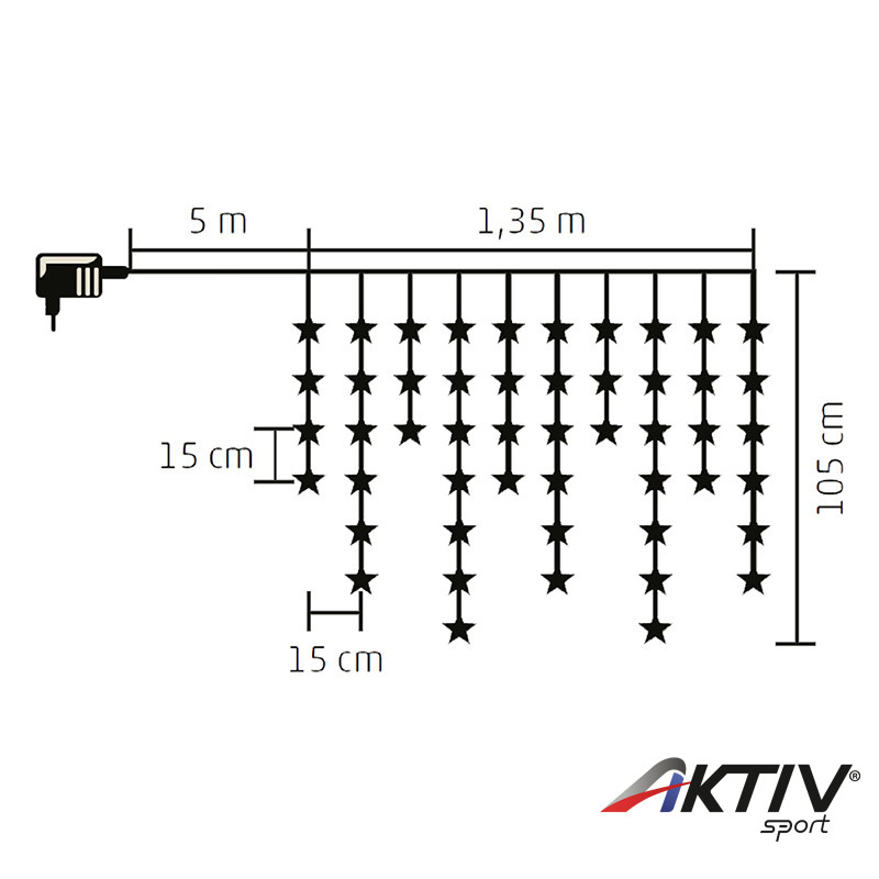 Az 50 darab 5 cm-es csillag világítását (állófényű, minden füzérben a legalsó csillag villog) 50 db hidegfehér LED biztosítja.