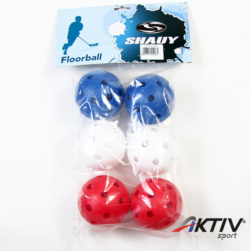 A Shauy Floorball labda 6 db-os csomagja három színben tartalmam labdákat, kék, fehér és piros színben, mindegyikből 2-2 darabot.