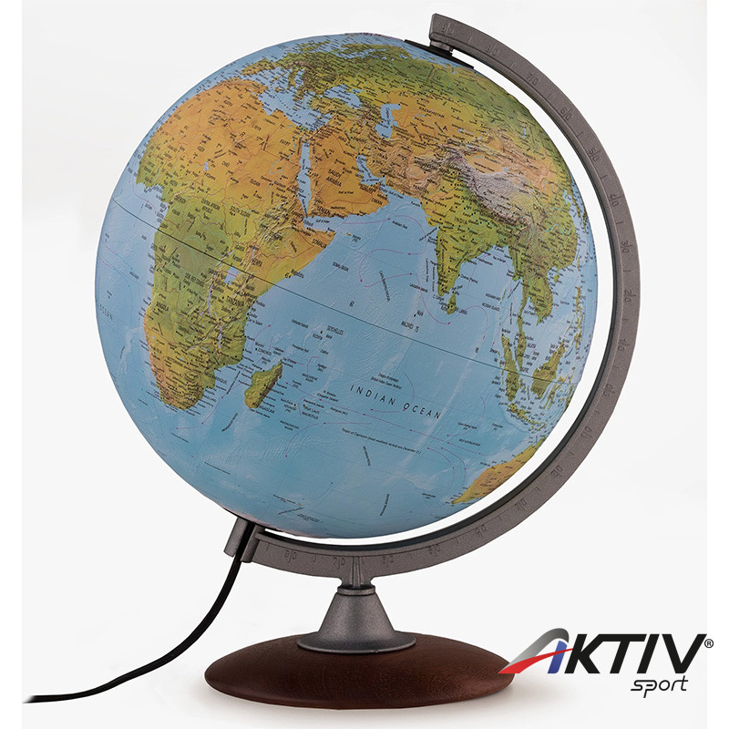 Fatalppal és műanyag meridiánnal. Domborzati és politikai színezéssel. Világítás nélkül a domborzat, kivilágítva az országhatárok hangsúlyosabbak. A gömb átmérője 30 cm, magassága 38 cm.