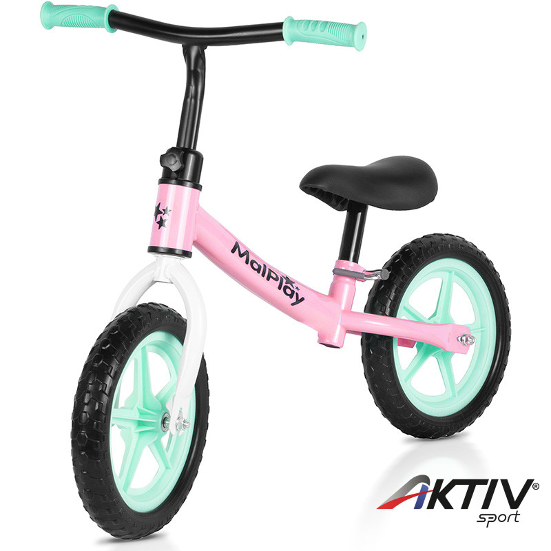 Pink-türkiz-fehér tanulóbicikli. Kiválóan alkalmas a kisgyermekek részére, hogy a biciklizés előtt megtanuljanak egyensúlyozni.