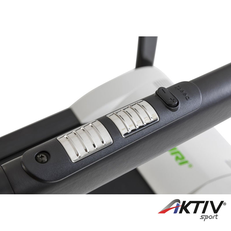 A Tunturi Endurance T80 futópad TFT-LCD kijelzője mutatja az időt, sebességet, távolságot, pulzust és programdiagramot.