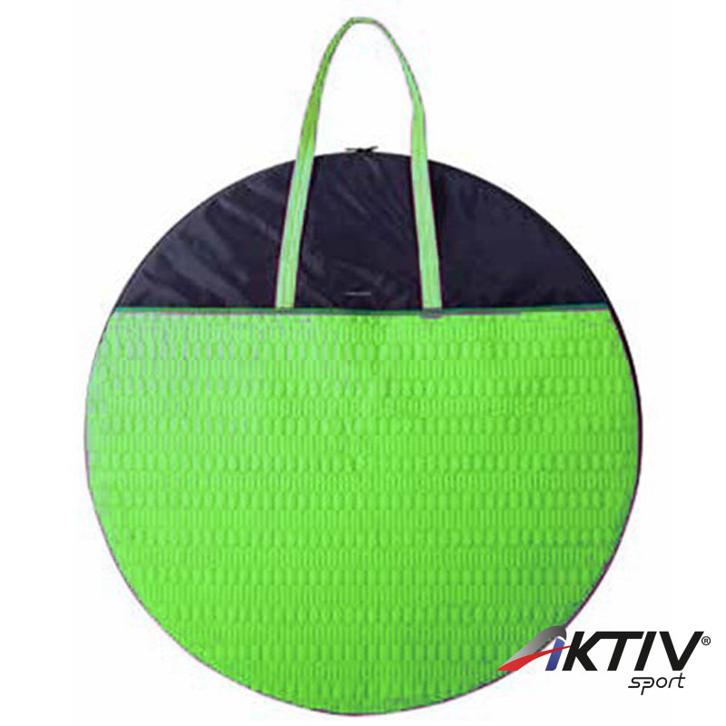 Ritmikus gimnasztikai eszköztartó táska zöld színben. A táska fogantyúval és cipzárral felszerelt, belső része rekeszes kialakítású. Használatával egyszerűen és könnyedén tárolhatóak a gimnasztikai eszközök.