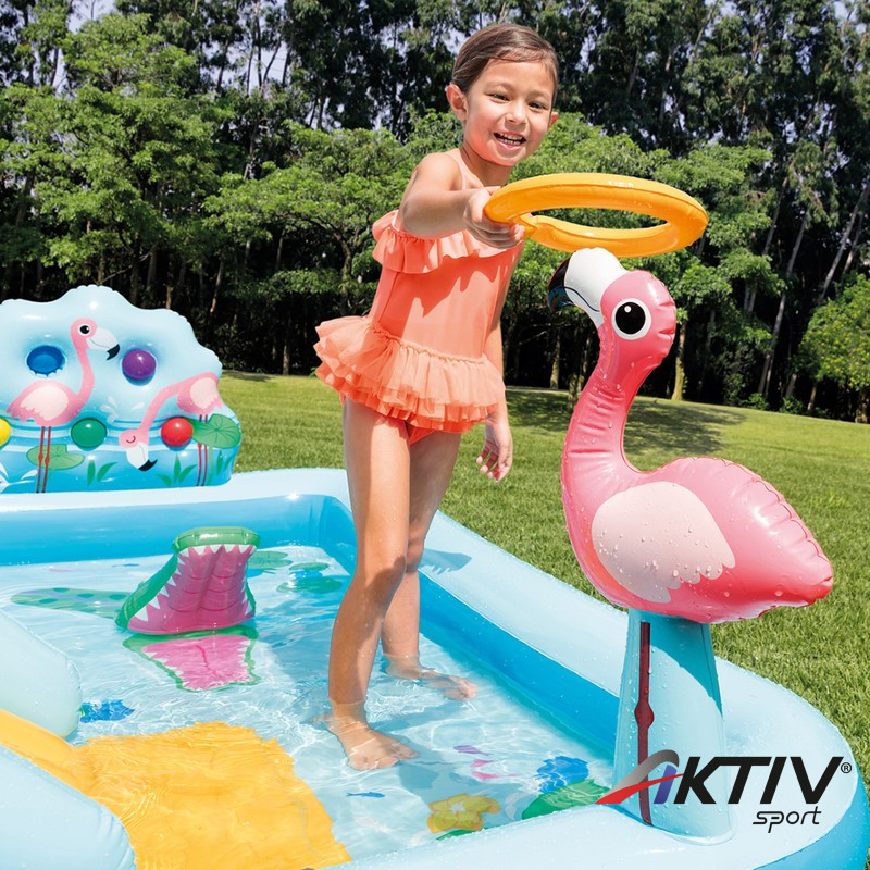 A játszómedencében csúszda is van, egy majom, egy karikadobásra alkalmas flamingó.