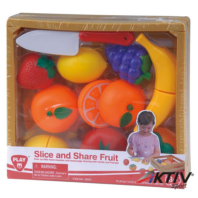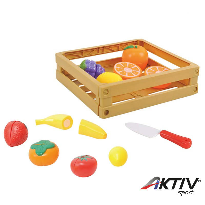 Gyümölcsfelező készlet különböző műanyag gyümölccsel, műanyag késsel és rekesszel.