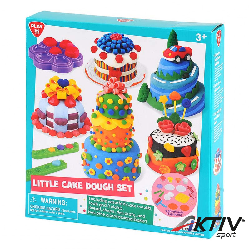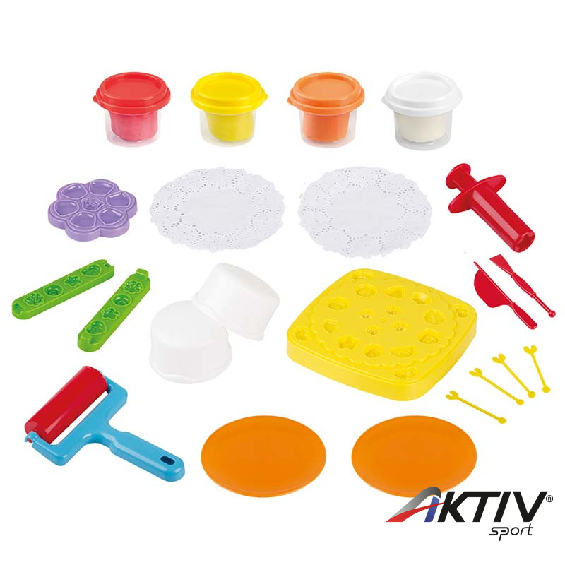 A készlet tartalmaz 5 különböző színű gyurmát, tortaformát, szerszámokat és 2 tányért.