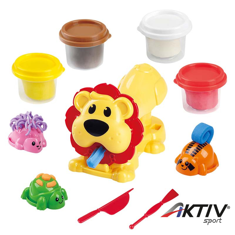 Az oroszlán sörénye körbe forgatható így, a sörényén lévő különböző formákon át lehet a gyurmát átnyomni, formázni.