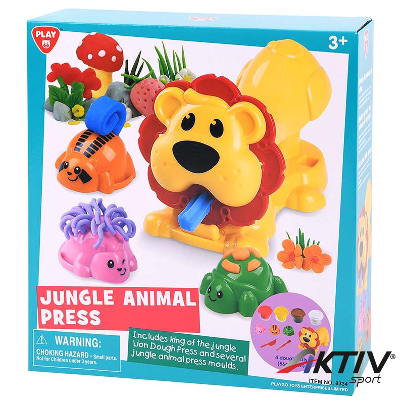 Dzsungel gyurmakészlet 4 különböző színű gyurmával, kétféle gyurmakéssel, 3 állatos gyurmaformával és egy oroszlános gyurmapréssel.
