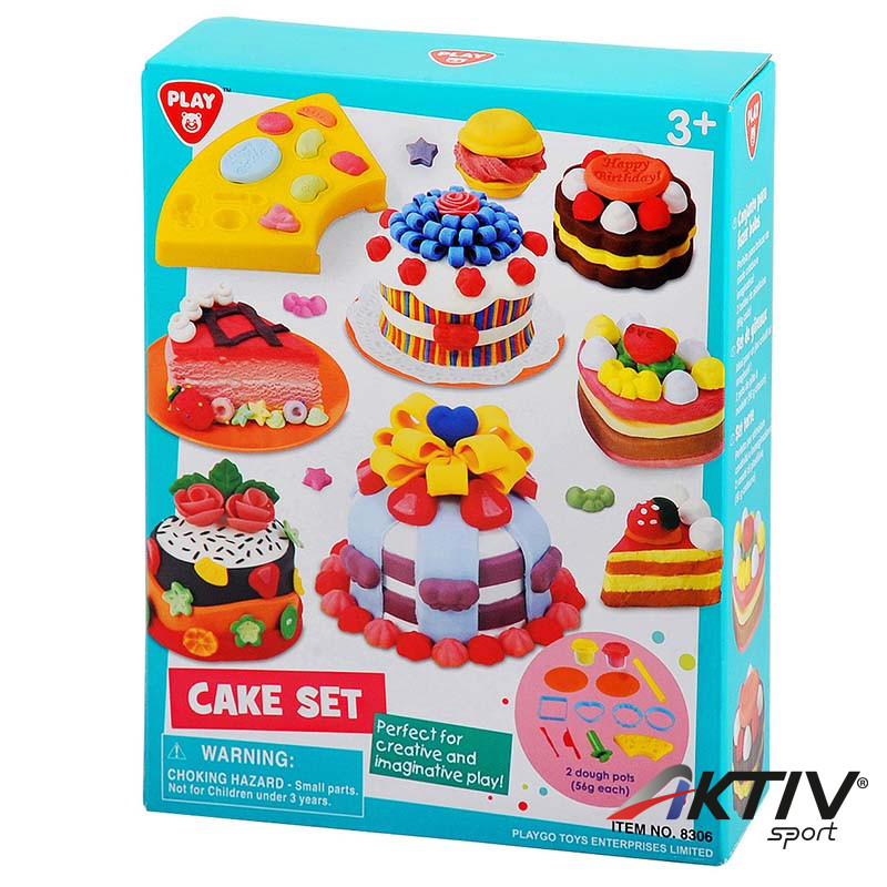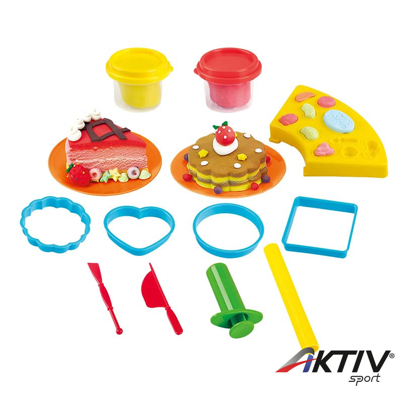 Kreatív tortakészítő gyurmakészlet 2 különböző színű gyurmával, gyurmaszerszámokkal (nyújtóhenger, csillagos kinyomó, formakiszúrók, gyurmakések, különböző 3-dimenziós formanyomó), 2db műanyag kistányérral.