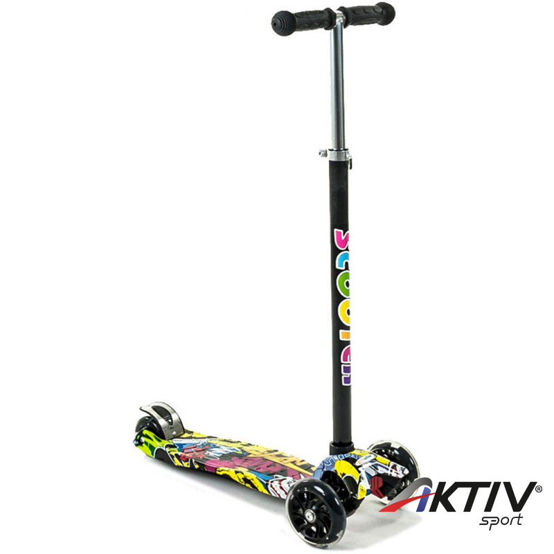 Fekete háromkerekű roller, amelynek nem csak vagány mintája van, de használatkor még a kerekei is világítanak!
