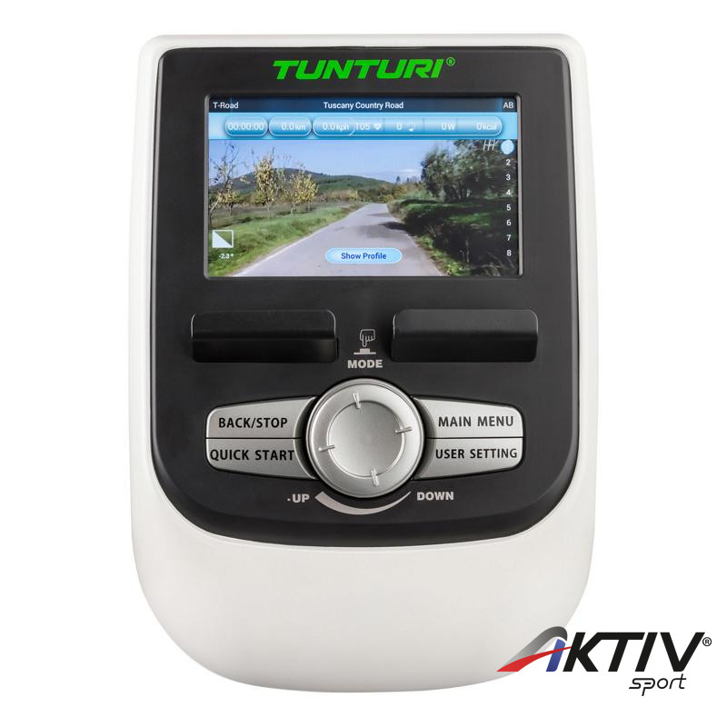 A színes TFT-LCD kijelzős, 43 különböző programvariációt kínáló, USB töltővel és Bluetooth kapcsolattal is ellátott komputer napról napra edzésre ösztönöz. A programok között olyan speciális, a Tunturi által kifejlesztett programok is találhatóak, mint a valós domborzati viszonyokat követő T-Ride vagy a T-Road, mellyel vizuálisan is nyomon követhetjük a különböző tájakon való edzést.
