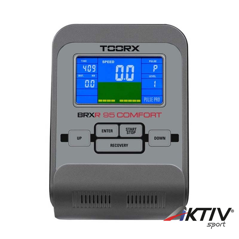 A Toorx BRX-R 95 háttámlás szobakerékpár kék háttérvilágítással rendelkező LCD kijelzője könnyen leolvasható, az edzés összes adatáról téjékoztatást nyújt.