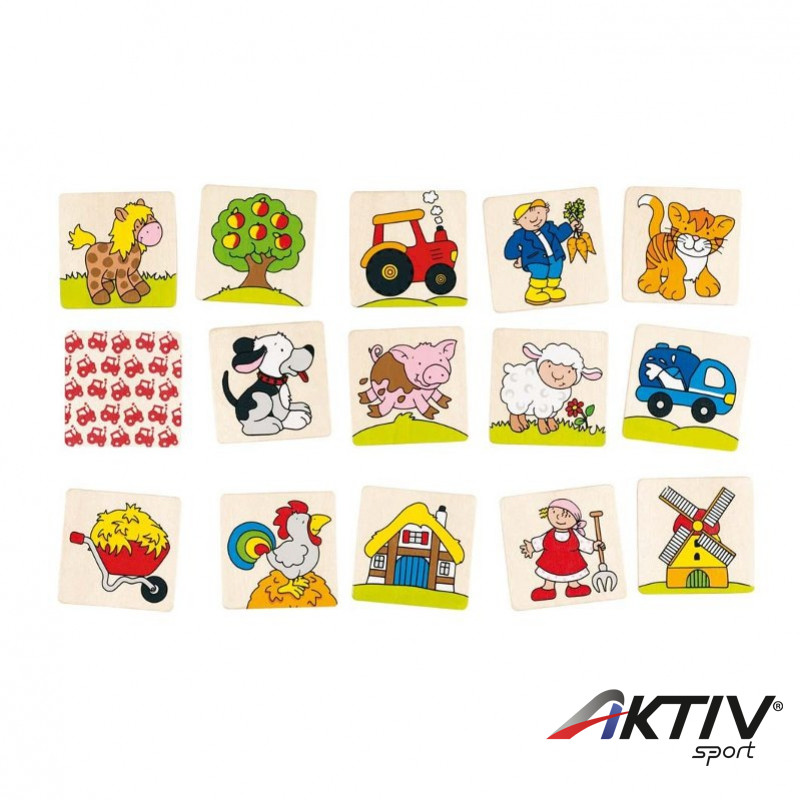 32 darabos (16 pár 5×5 cm-es elemek) memóriajáték fából, kedves, színes, falusi élethez kötõdõ képekkel. 3 éves kortól ajánlott.