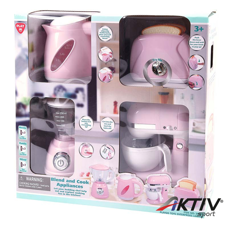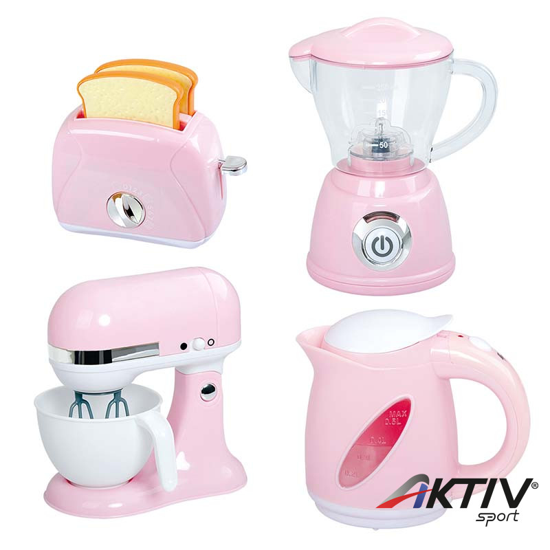 A Playgo háztartási játék gép szett rózsaszínű, és 4 elemből áll: turmixgép, kenyérpirító, keverő, vízforraló. A szettel gyerekjáték lesz a sütés - főzés.