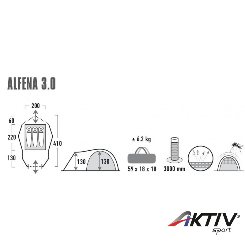Az Alfena 3 egy kiváló kemping sátor, jól ismert kupola alakú. Az alagút lakóövezetként és tárolóhelyként szolgál a kemping felszereléshez. Az Alfena 3 védő alumínium bevonattal van ellátva. A bevonat erősíti a külső sátorszövetet, akár 17% -kal hőcsökkentő, és UV-védő tényezővel rendelkezik (UV-szabvány 801).