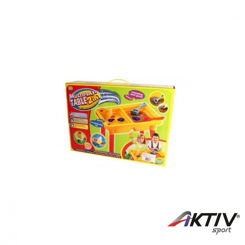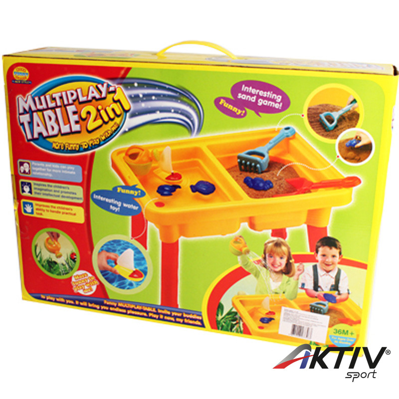 Kettõ az egyben, variálható műanyag homokozó-asztal. Az asztal egyik rekeszébe vizet, a másikba homokot lehet rakni. A termékhez két szűkítõ tálca és néhány homokozó eszköz is tartozik.
