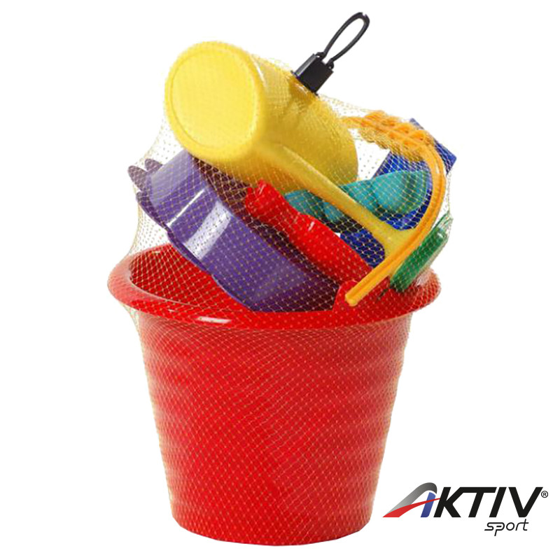 A homokozó szettben található egy vödör, szita, lapát, kanna és két homokozó forma is.