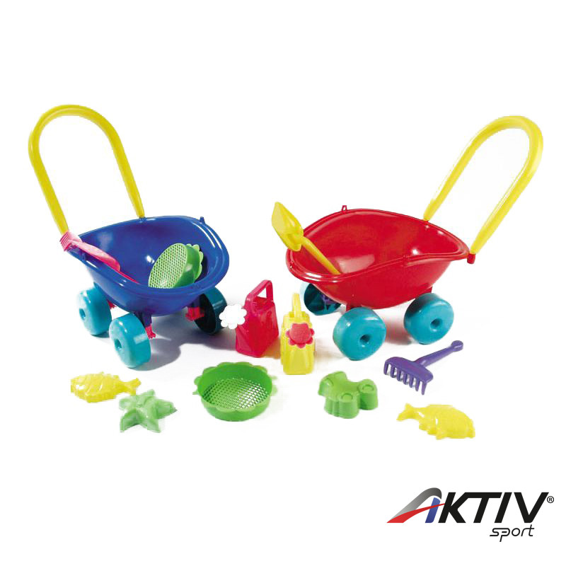 A homokozó szett tartalmaz: talicskát, öntözőt, gereblyét. lapátot és két formát.