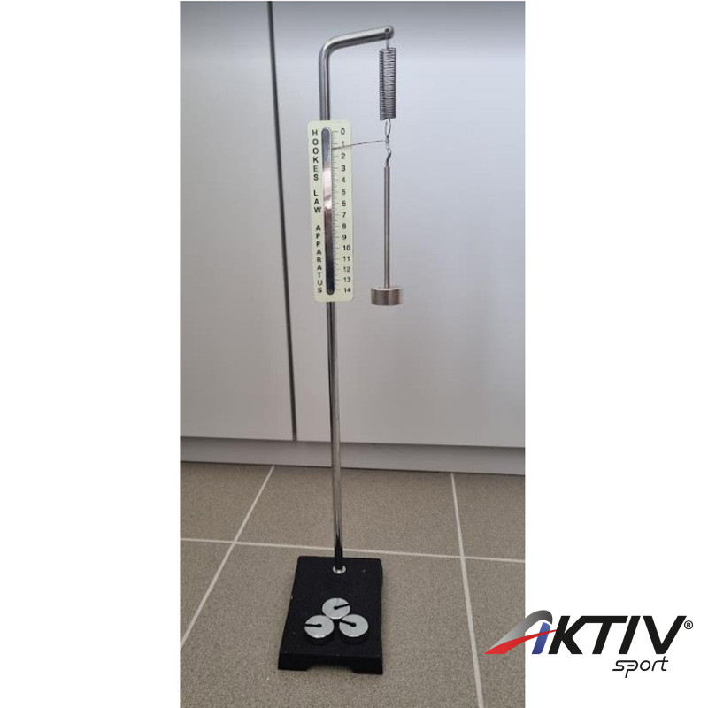 Hook-törvényét igazoló készlet állványon, skálával, réselt súlykészlettel.