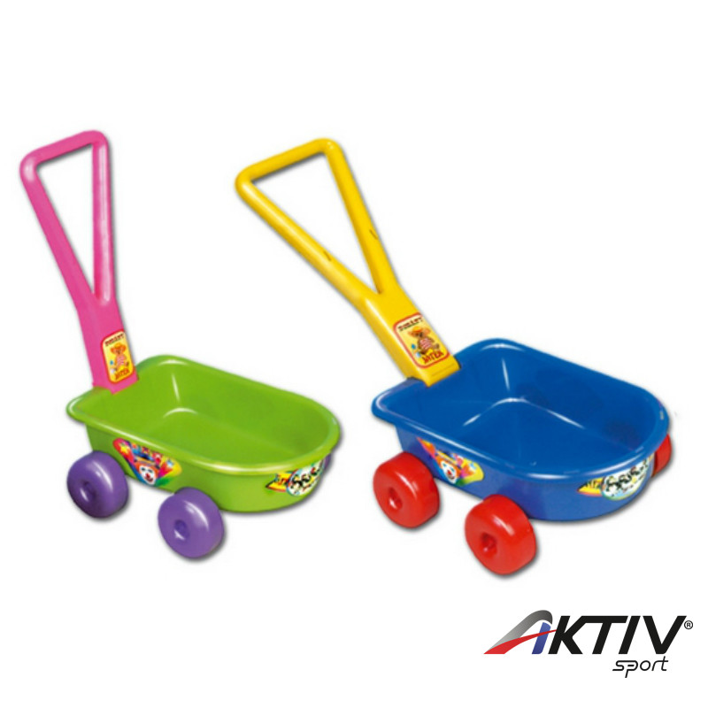 Zöld, piros és kék színben kapható műanyag kiskocsi. Magyar termék.