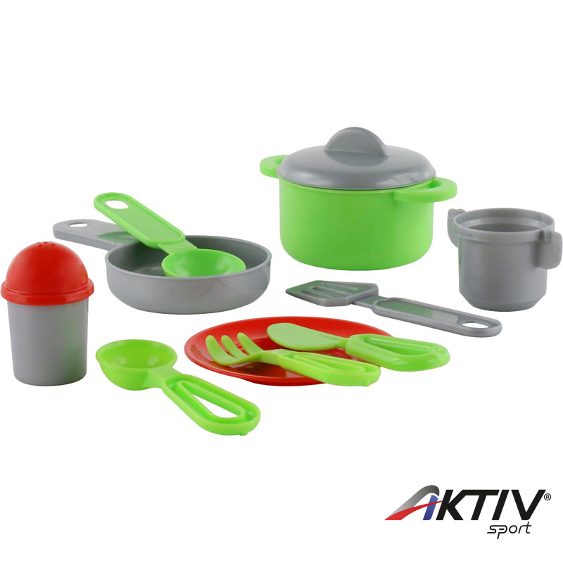 A szett tartalma: főzőlap, sütőlap, mosogató, csepegtető, csaptelep, 1 db fazék, 1 db serpenyő, 1 db tányér, 1 db kanál, 1 db villa, 1 db kés, 1 db pohár, 1 db fakanál, 1 db shaker.