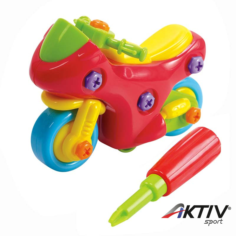 Versenymotor járműszerelő készlet csavarhúzóval, csavarokkal és járműalkatrészekkel.