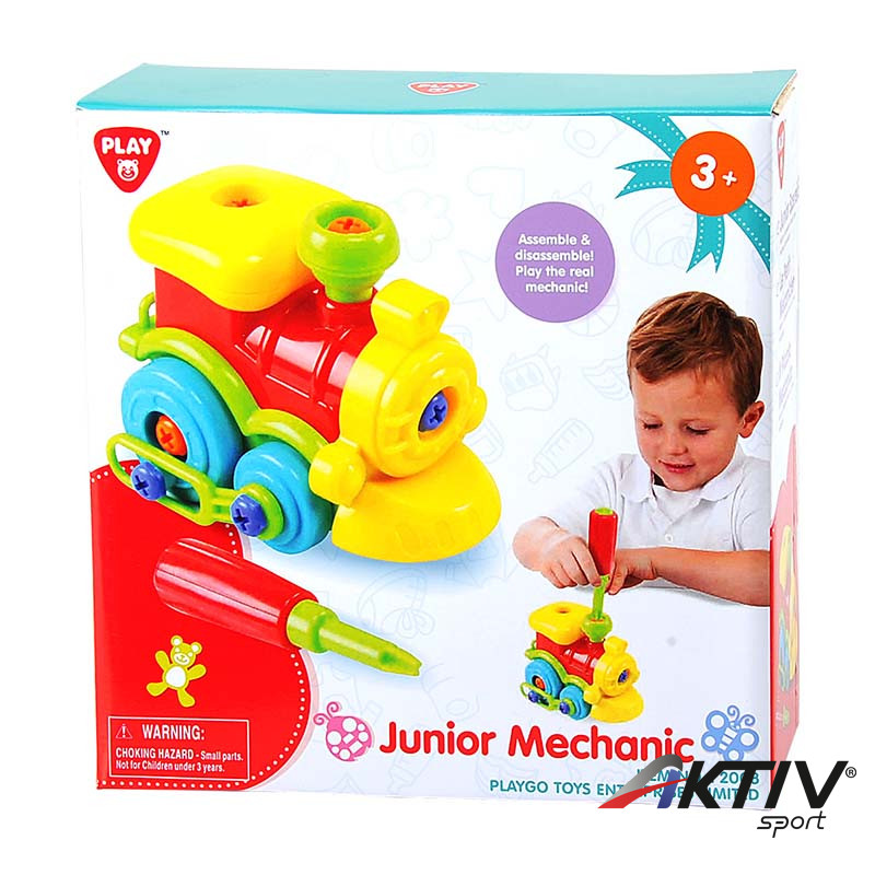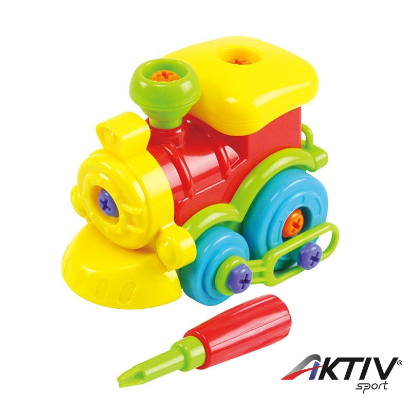 Vonat járműszerelő készlet csavarhúzóval, csavarokkal és járműalkatrészekkel.