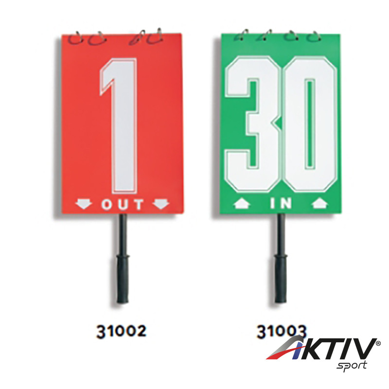 A zöld színű tábla a pályára felmenő játékost jelzi, " IN " felirattal.